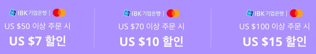 - IBK마스터 카드 $50 이상 구매 시 $ 7 할인, $70 이상 구매 시 $ 10 할인, $100 이상 구매 시 $ 15 할인
