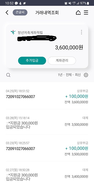 그리고 매달 10만 원씩 입금하여 드디어 36개월을 채웠습니다.